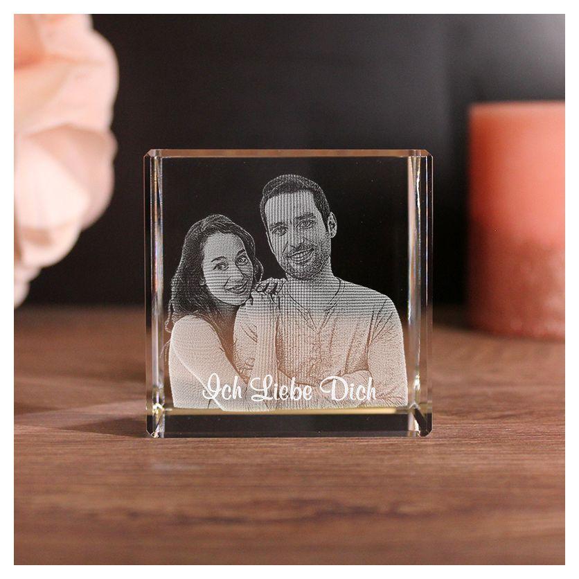 Mit diesem schönen Glaswürfel kannst du einem besonderen Menschen eine große Freude bereiten. Wir halten euren ganz besonderen Moment für die Ewigkeit fest. Und das auch noch in 3D! Egal ob zu Weihnachten, zum Geburtstag oder zum Jahrestag. Mit diesem Geschenk liegst du immer goldrichtig! Wir gravieren in den Glaswürfel dein Wunschfoto in 3D und deinen Wunschtext ein.