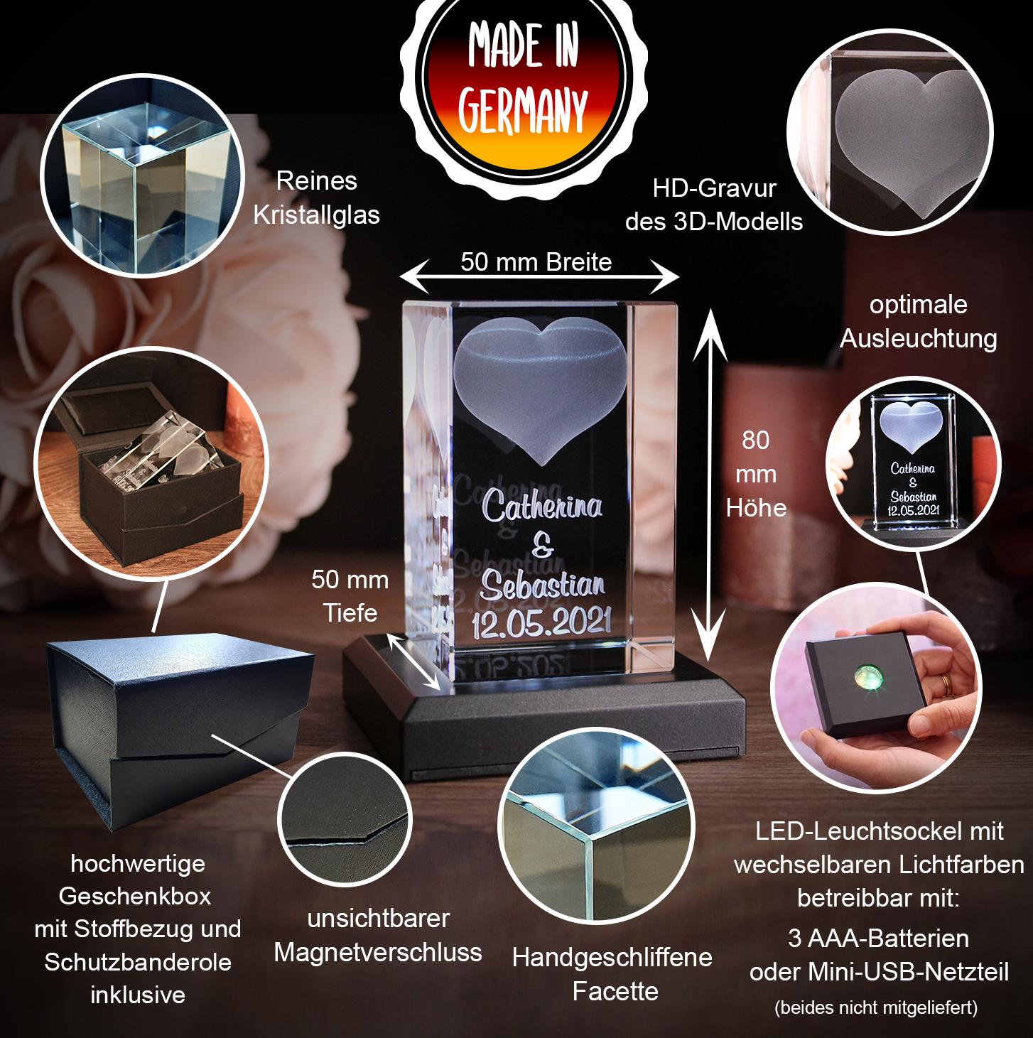 - 3D Glaskristall in den Abmessungen 80mm x 50mm x 50 mm (Höhe x Breite x Tiefe)