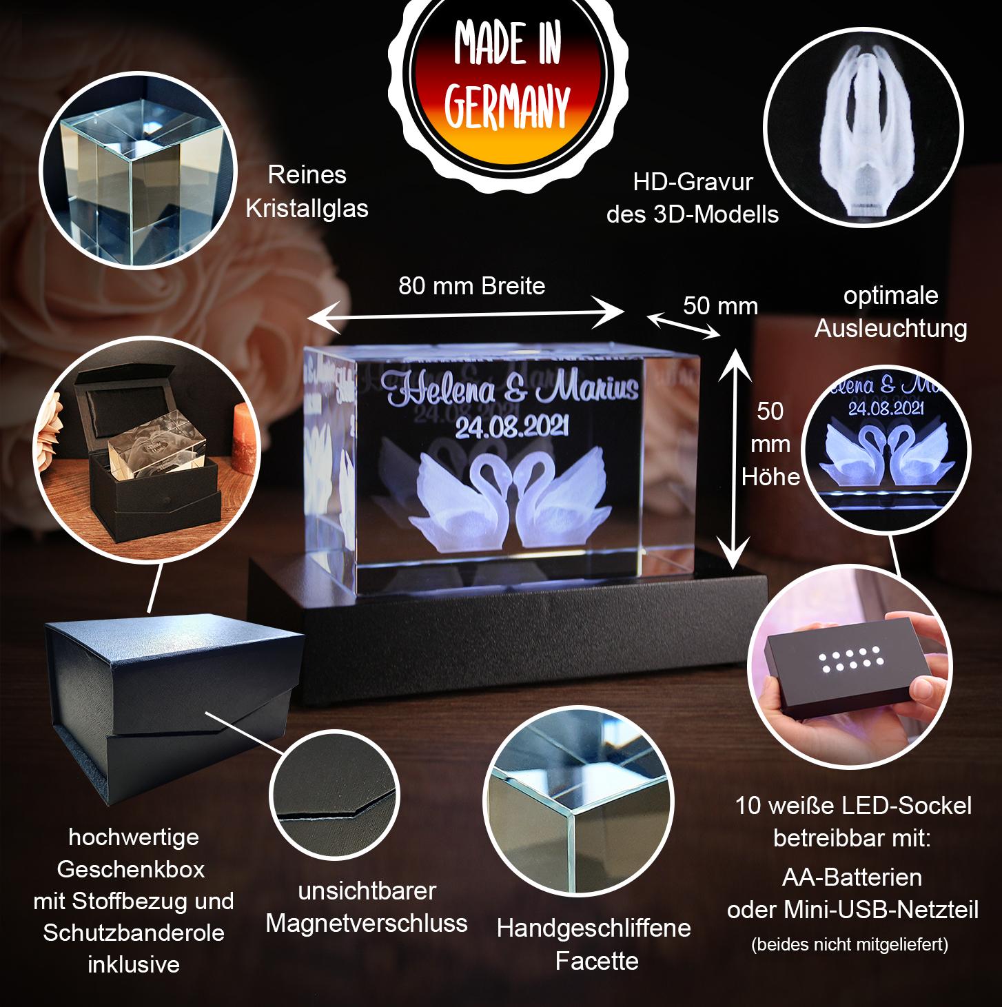 Eigenschaften "LoveGoals 3D Glaskristall zwei Schwäne mit Wunschnamen"
