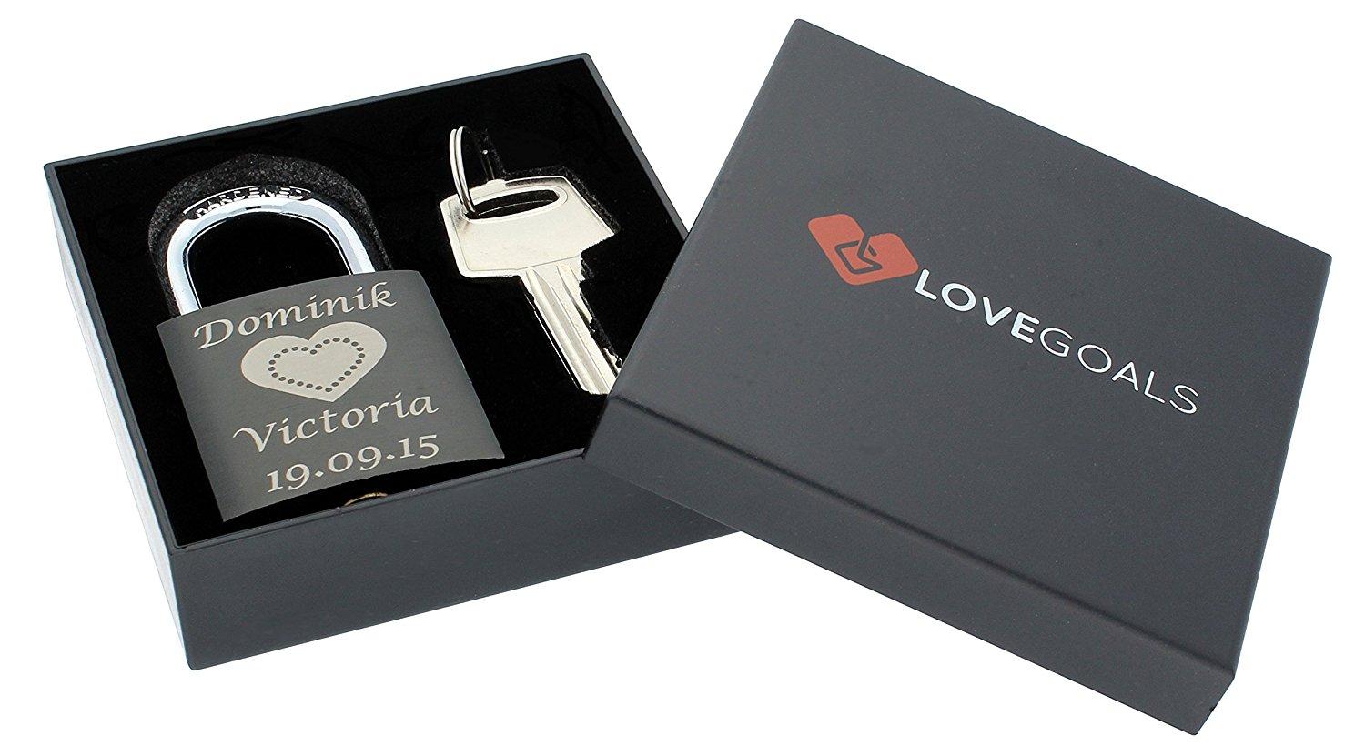 Das eloxierte Liebesschloss mit Gravur und Schlüssel besticht durch die sehr hohe Qualität - Detailliert und individuell graviert! Die Geschenkverpackung mit unserem LoveGoals Logo und dem Herz rundet das Paket perfekt ab. das ideale Geschenk zum Valentinstag, Geburtstag, Weihnachten, Jahrestag, Hochzeit oder Verlobung oder einfach zwischendurch, um seinem Liebsten oder seiner Liebsten eine Freude zu machen.