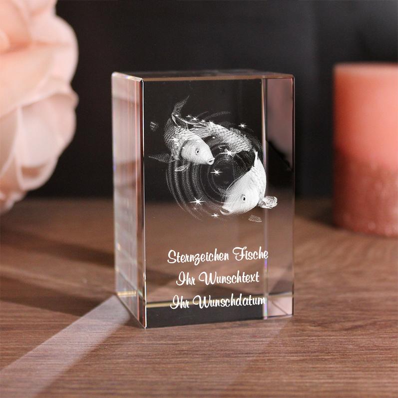 Produktinformationen "Lovegoals 3D Glasquader Sternzeichen Fische mit Deinem Wunschtext graviert"